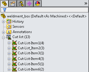 Cut list folders with meaningful names provide more information when you check the weldment structure and allow for better communication when you share documents. You can manually rename the folders, or you can automate cut list folder naming.