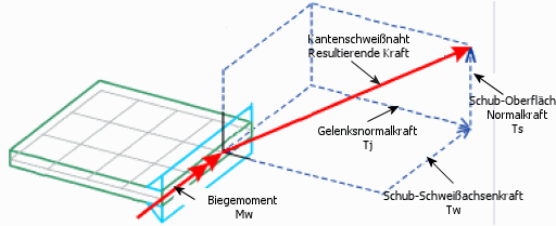 Eine Komponente der Schweißkraft (Tj), die sich normal auf die schneidende Schalenkante des abgeschlossenen Teils entlang der normalen Achse der Schweißnahtverbindung, Uj, verhält.