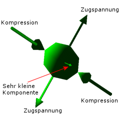 Bei einer bestimmten Ausrichtung des Materialelements (siehe Abbildung 1) gehen alle Schubspannungskomponenten verloren, und die Spannungen reduzieren sich auf reine Normalspannungen (siehe Abbildung 2).