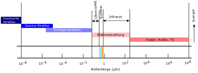 Wärmestrahlung ist die Wärmeenergie, die von Körpern aufgrund ihrer Temperatur in Form von elektromagnetischen Wellen ausgestrahlt wird. Alle Körper mit Temperaturen über dem absoluten Nullpunkt geben Wärmeenergie durch Strahlung ab. Weil sich elektromagnetische Wellen auch im Vakuum fortbewegen, ist kein übertragendes Medium für die Strahlung notwendig. Die folgende Abbildung zeigt in Wellenlängen den Bereich der Wärmestrahlung im Vergleich mit Strahlung, die auf andere Weise abgegeben wird (Röntgenstrahlen, γ-Strahlen, Höhenstrahlen usw.).