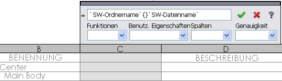 In diesem Beispiel wird die Komponentendateiposition in einer Stücklistentabelle durch die Kombination der Eigenschaften SW-Ordnername und SW-Dateiname angezeigt.