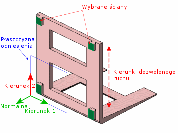 Używając płaszczyzny odniesienia (w kolorze niebieskim) wideł, można umocować wybrane ściany (w kolorze ciemnozielonym) wzdłuż kierunku 1 i kierunku normalnego (w kolorze jasnozielonym). Pozostawia to wybranym ścianom swobodę ruchu wzdłuż kierunku 2 (w kolorze czerwonym).