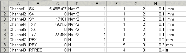 - Kolumna 5: czas (używane dla testu upuszczenia, nieliniowej kontroli przemieszczenia i siły oraz termicznego stanu nieustalonego)