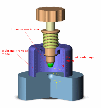 Wybrana ściana wkrętu (ukazana kolorem zielonym) ma przemieścić się na odległość 0.5 cm w kierunku określonym przez wybraną krawędź (ukazaną kolorem zielonym). Aby zidentyfikować kierunek, należy użyć Podglądu. Aby go odwrócić, należy użyć wartości ujemnej -0.5 cm.