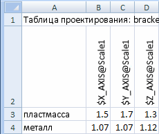 В заголовках столбцов, которые управляют коэффициентами масштаба X, Y и Z, используется следующий синтаксис: