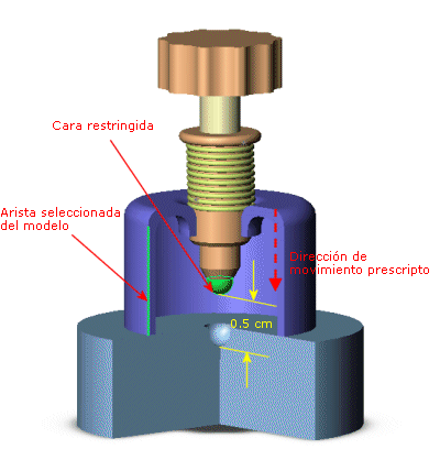 Puede usar una arista de modelo recta como referencia para aplicar restricciones. Puede prescribir la traslación en la dirección de la arista. Para mallas de vaciados, también puede especificar la rotación alrededor de la arista.