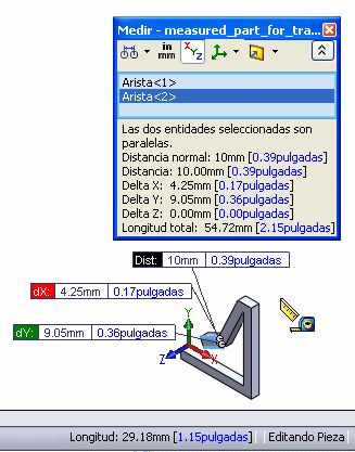 Puede configurar la herramienta Medir para visualizar dos unidades de medida. Por ejemplo, puede especificar que aparezcan las medidas en milímetros y pulgadas en el cuadro de diálogo Medir, las anotaciones de medidas y la barra de estado.