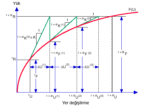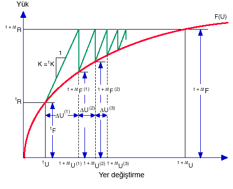 Doğrusal olmayan statik analizde, herhangi bir “zaman” adımında (t+Δt) çözülecek temel denklem seti şudur: