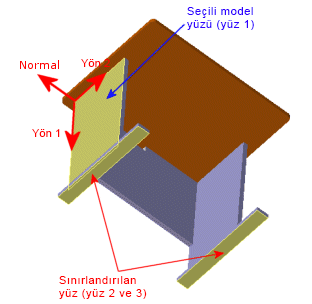 2 ve 3 yüzlerinin yüz yönü 1 (Yön 1) boyunca hareketini sıfıra ayarlamak için model yüzü 1'i referans olarak kullanabilirsiniz. Diğer iki yön (Yön 2 ve Dik) belirtilmeden bırakılmalıdır. |