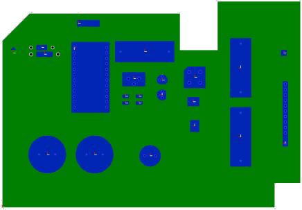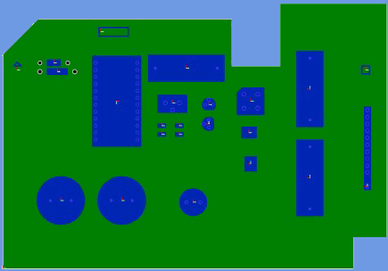 Você pode ver as origens dos componentes na visualizaçãodo CircuitWorks . Na ilustração abaixo, o CircuitWorks mostra as origens de um arquivo IDF aberto. A maioria dos componentes tem a origem no centro, exceto o componente retangular fino no canto inferior direito, que tem a origem no pino-1.