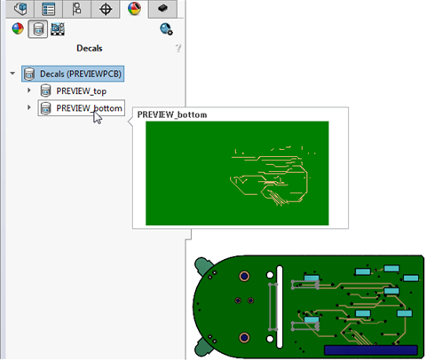 6. Para visualizar os traços de cobre, na guia DisplayManager, clique em Exibir decalques, depois passe o mouse sobre a visualização.