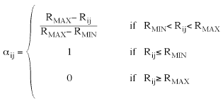 A distânciaRij está entre RMIN e RMÁX ( RMÍN < Rij < RMÁX) definidas pelo usuário. O grau de correlação é constante para RMín. menor ou igual a Rij e diminui linearmente no intervalo RMáx. - RMín.. |