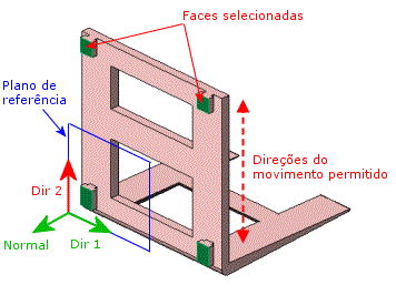 Ao usar o plano de referência do garfo (mostrado em azul) , você pode restringir as faces selecionadas ao longo da Dir 1 (mostradas em verde escuro) e da direção normal (mostrada em verde claro). Isso deixa as faces selecionadas livres para se moverem ao longo da Dir 2 (mostradas em vermelho).
