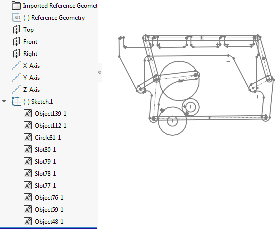 Na árvore de projeto do FeatureManager, os esboços são exibidos na hierarquia correta. Se o arquivo .SLDXML contém grupos de esboço flexíveis ou rígidos, você pode optar fazer a leitura dos objetos de esboço como blocos. As restrições de esboço criadas nos aplicativos do SOLIDWORKS 3DEXPERIENCE são mapeadas em restrições de esboço equivalentes no esboço do SOLIDWORKS. Da mesma forma, todas as entidades de esboço são mapeadas em entidades de esboço equivalentes DO SOLIDWORKS.