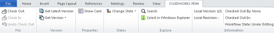 Microsoft Office 插件可在 Microsoft Word、Excel 和 PowerPoint 文档中提供集成的 SOLIDWORKS PDM 功能区。
