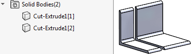 在零件文件中的實體數目會顯示在實體旁邊的括弧中。如果好幾個本體是從同一個特徵產生而來,副本數出現在列於實體中的每個副本後的方括弧中。例如,下列的零件包含由一個伸長除料所產生的兩個實體: