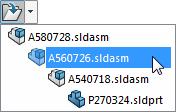 您可以按一下次組合件的其中一個零組件,從圖面中開啟次組合件,並從文意感應工具列上的開啟零件下拉式清單中選擇次組合件。