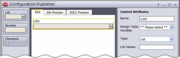 Configuration Publisher 對話方塊中,您於中間的窗格建立自訂的 PropertyManager。您從左邊的調色盤中拖曳控制項(清單方塊、數字方塊、及核取方塊),然後在右側的窗格中設定這些控制項的屬性。