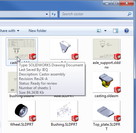 Aplikaci Průzkumník Windows můžete použít k zobrazení náhledů a pro přístup k informacím o uživatelských vlastnostech dokumentů SOLIDWORKS.