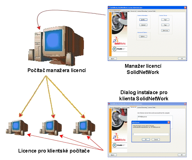 - Manažer licencí SolidNetWork je instalován a aktivován pouze na počítači manažera licencí.