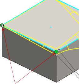 , ainsi que les points de contrôle sélectionnés dans la zone graphique. Les sommets qui se connectent à plus d'une arête arrondie s'affichent dans la liste avec *V. Ces sommets s'affichent également avec un point de contrôle à plusieurs arêtes dans la zone graphique. Vous pouvez inverser l'orientation du congé sur une ou plusieurs arêtes qui croisent le sommet. Cliquez sur le point de contrôle à plusieurs arêtes pour sélectionner les arêtes dont vous souhaitez inverser l'orientation.