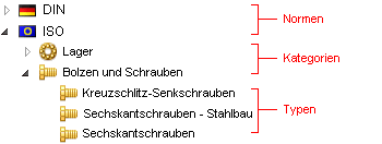 Die Struktur Toolbox Normen im linken Fensterbereich führt neben den benutzerdefinierten Ordnern und Komponenten, die Sie definieren, Normen, Kategorien und Typen auf.