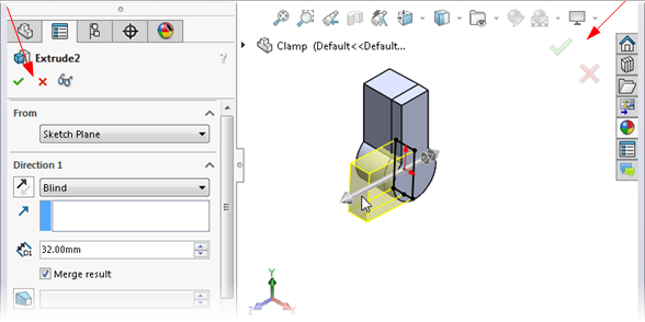 in der linken oberen Ecke des PropertyManagers und im Bestätigungs-Eckfeld, während Ihr Cursor sich möglicherweise in der Mitte des Grafikbereichs befindet, wo Sie das Modell bearbeiten.