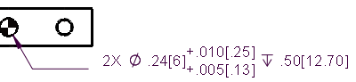 In Bohrungsbeschreibungen mit Toleranzen für Durchmesser werden nominale Doppelbemaßung, Höchst- und Mindestwerte innerhalb von Klammern gruppiert, statt zwischen den einzelnen Beschreibungselementen getrennt zu werden.
