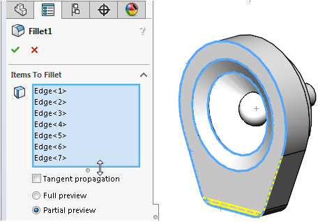 Wenn Sie jetzt ein Verrundungs-Feature erstellen und viele Kanten auswählen müssen, während Sie Auswahlen vornehmen, wird die Liste erweitert.