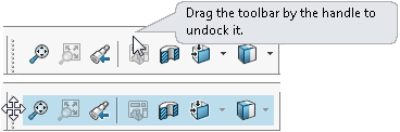 Mit SOLIDWORKS 2016 ist der Ziehbereich auf den Ziehpunkt beschränkt. Wenn Sie auf eine beliebige andere Stelle auf der Symbolleiste klicken, werden Sie aufgefordert, die Symbolleiste am Ziehpunkt zu ziehen, um sie abzudocken.