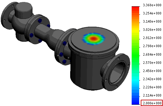Sie können die Höchst- und Mindestwerte von Simulations-Ergebnissen in Konturdarstellungen (automatischer oder definierter Status) unabhängig voneinander steuern. Sie können eine Farbe auswählen, die vom Standard-Farbbereich abweicht, um Ergebnisse anzuzeigen, die außerhalb der von Ihnen spezifizierten Grenzwerte liegen.