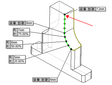 대칭이나 대칭 유동 크기 필렛의 꼭지점 사이에 있는 통제점에 반지름을 지정하여 조절할 수 있습니다.