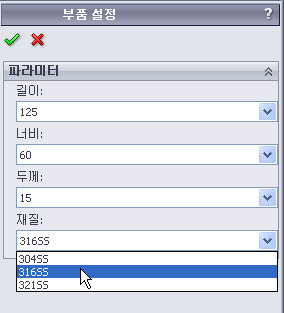 사용자 정의 PropertyManager는 부품을 어셈블리에 삽입할 때 원하는 설정 선택을 용이하도록 돕습니다. 부품을 삽입할 때, PropertyManager가 나타나며 모델 변수에 따라 설정을 선택합니다. 나중에 다른 설정으로 변경하려면, PropertyManager를 다시 열고 다른 모델 변수를 선택합니다.