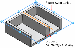 Jeżeli dodamy pochylenie, można ustawić grubość na płaszczyźnie szkicu lub interfejsie ściany. Należy wybrać jedną z poniższych opcji: