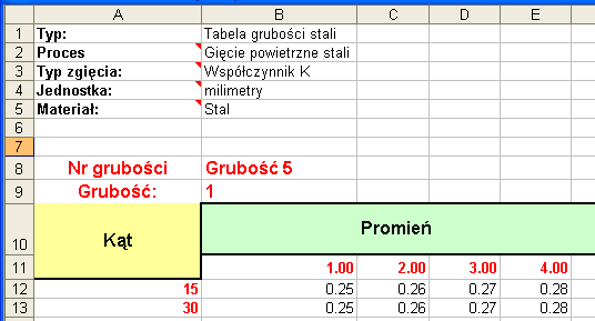 Poniżej ukazano połączoną tabelę grubości/zgięć. Dla każdej grubości można dokonywać wyboru z zakresu promieni i kątów.