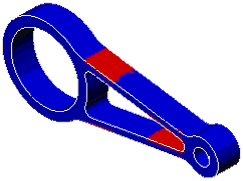 Clique em Exibir onde o fator de segurança (FOS) é inferior a para ver o fator de segurança mínimo em todos os locais da peça. Os códigos padrão de engenharia em geral requerem um fato de segurança de 1,5 ou maior. Para um dado fator de segurança mínimo, o SimulationXpress plota as possíveis áreas seguras e inseguras em azul e vermelho, respectivamente.