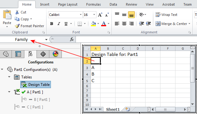 Quando você edita uma tabela de projeto, pode criar linhas acima e colunas à esquerda da célula Family. O exemplo abaixo é uma tabela de projeto válida, contanto que os nomes das configurações e os parâmetros do SOLIDWORKS sejam mantidos abaixo e à direita da célula Family.