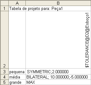 Exemplo de uma tabela de projeto que controla uma tolerância: