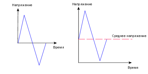 Амплитуда знакопеременного напряжения цикла напряжений вычислена как половина диапазона напряжения в цикле. Величина разрушения, вызванного циклом напряжений, зависит не только от знакопеременного напряжения, но также от среднего напряжения. Например, два цикла ниже имеют одинаковое знакопеременное напряжение, но так как они имеют различные средние значения напряжения, они вызовут различные количества разрушений.