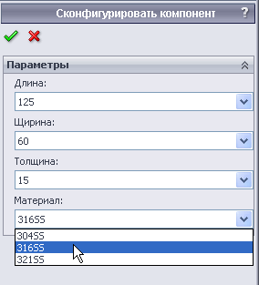 Настроенный пользователем PropertyManager упрощает выбор необходимой конфигурации при вставке компонента в сборку. При вставке компонента отображается PropertyManager, и Вы можете выбрать конфигурацию в зависимости от параметров модели. Позже, если возникнет необходимость выбрать другую конфигурацию, Вы можете снова вызвать PropertyManager и выбрать другие параметры модели. |