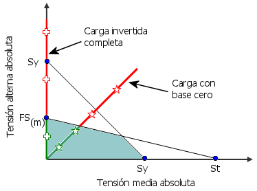 Las regiones azul y roja del trazado de comprobación de fatiga se determinan a partir del diagrama que se encuentra a continuación. Para cada nodo, el programa calcula las tensiones alterna y media sobre la base del tipo de evento de fatiga definido.