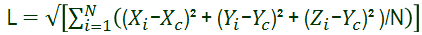 donde: Xi, Yi y Zi son las coordenadas de nodo i; X c, Yc y Zc son las coordenadas del centro geométrico del modelo; y N es el número total de nodos en el modelo.