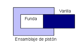 Para este ensamblaje de pistón, defina un conector de pasador entre la cara interna de la funda y la cara de la varilla. Puede utilizar un resorte axial para especificar la resistencia al deslizamiento de la varilla hacia dentro y hacia afuera de la funda. |