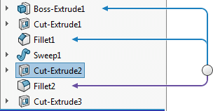 La Visualización de referencias dinámicas le permite ver las relaciones principales y secundarias entre elementos del gestor de diseño del FeatureManager. Al pasar el cursor sobre una operación con referencias en el gestor de diseño del FeatureManager, se visualizan flechas que muestran las relaciones. Las flechas azules muestran relaciones de operaciones padres. Las flechas moradas muestran relaciones de operaciones secundarias.