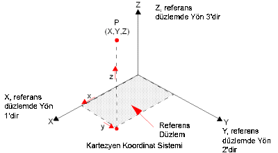 Referans düzlem, şekilde gösterildiği gibi bir Kartezyen koordinat sistemi tanımlar.