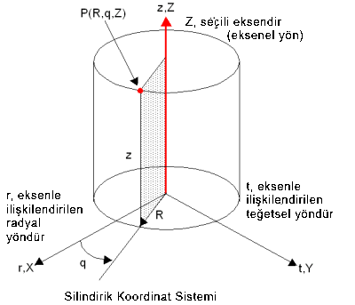 Referans eksen, şekilde gösterildiği gibi bir silindirik koordinat sistemi tanımlar. Referans eksenler radyal ve teğet kısıtlamaların belirtilmesi açısından yararlı ve gereklidir.