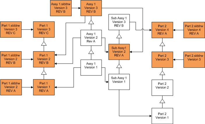 在参考引用的版本串流中,文件版本升级工具还升级最新零件,如蓝色