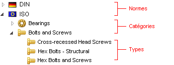L'arbre Normes Toolbox du volet de gauche répertorie les normes, les catégories et les types, outre les dossiers personnalisés et les composants que vous définissez.
