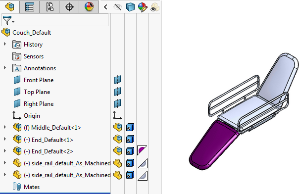 A estrutura da montagem é exibida na árvore de projetos do FeatureManager, do SOLIDWORKS, com cores representadas no estado de exibição do modelo.