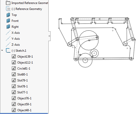 Na árvore de projeto do FeatureManager, os esboços são exibidos na hierarquia correta. Se o arquivo .SLDXML contém grupos de esboço flexíveis ou rígidos, você pode optar fazer a leitura dos objetos de esboço como blocos. As restrições de esboço criadas nos aplicativos do SOLIDWORKS 3DEXPERIENCE são mapeadas em restrições de esboço equivalentes no esboço do SOLIDWORKS. Da mesma forma, todas as entidades de esboço são mapeadas em entidades de esboço equivalentes DO SOLIDWORKS.